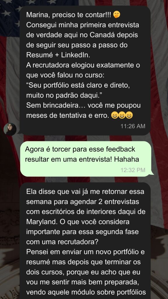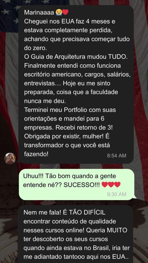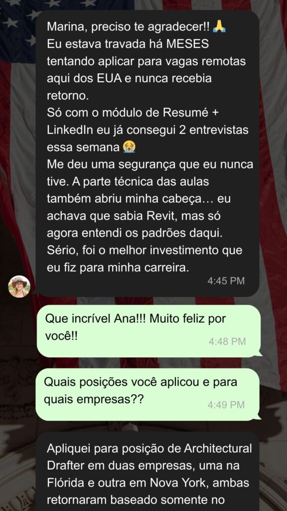 Desde 2019, construí minha carreira no mercado norte-americano atuando em diferentes contextos profissionais — de escritórios boutique de interiores a grandes firmas de arquitetura, como PAGE/Think e Perkins&Will. Ao longo dessa trajetória, também recebi diversas ofertas de empresas amplamente reconhecidas no mercado dos EUA, incluindo Gensler, HOK, TVS Design e Cooper Carry.