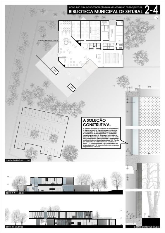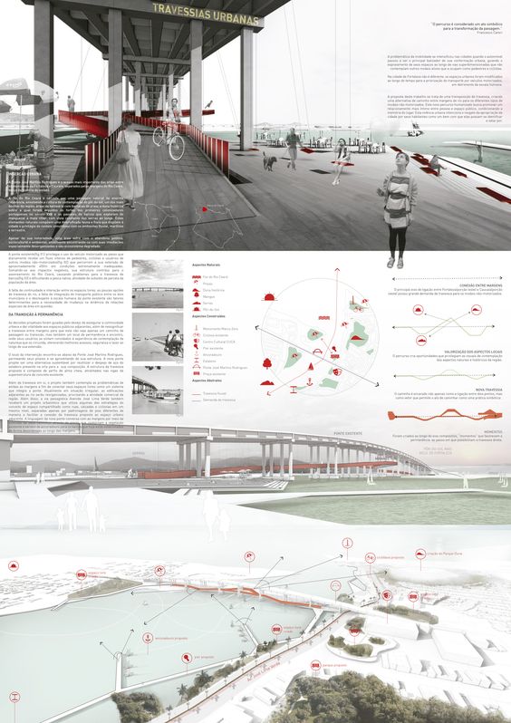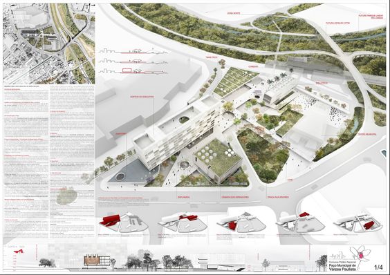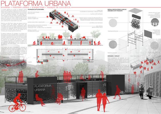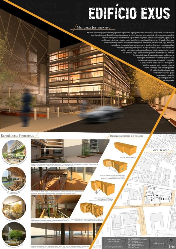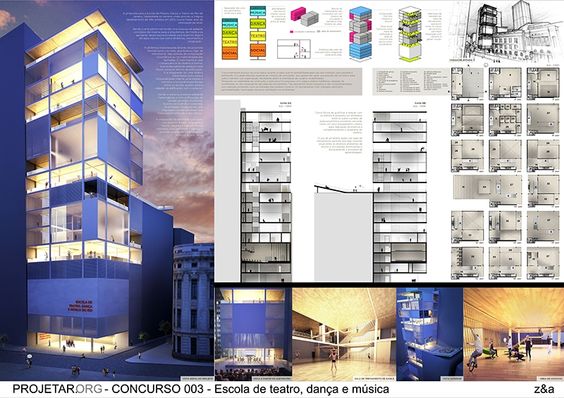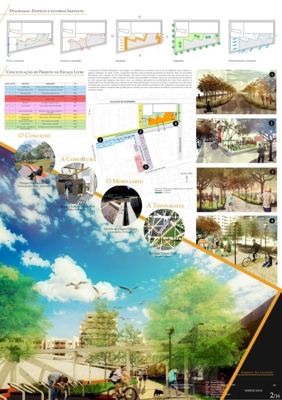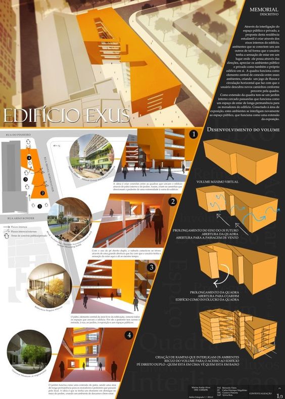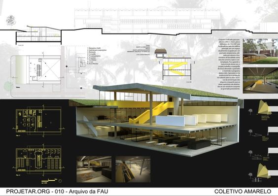 Olhem que interessante essas pranchas: todas possuem um elemento em destaque. Nos primeiros segundos o leitor já consegue ver qual o destaque do projeto devido à escala dele em relação aos outros elementos. A prancha à direita eu diagramei para um concurso que eu participei alguns anos atrás.