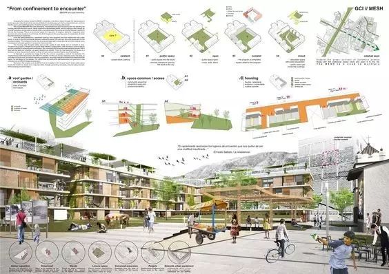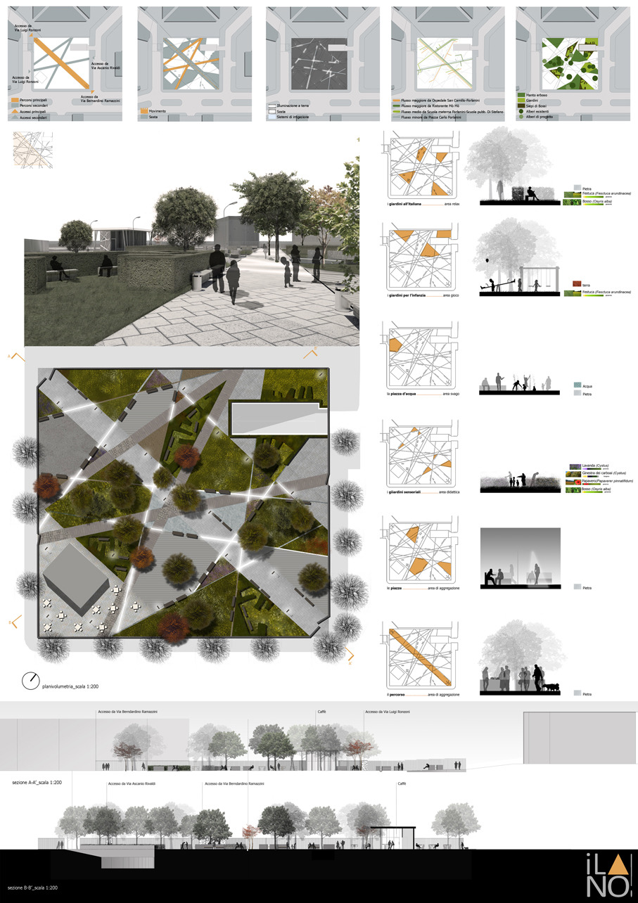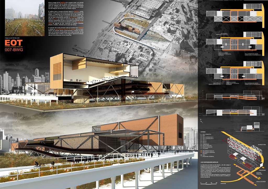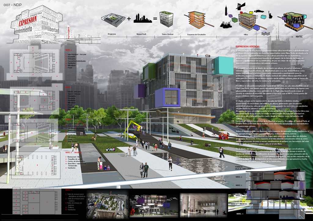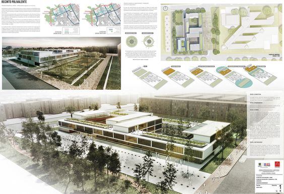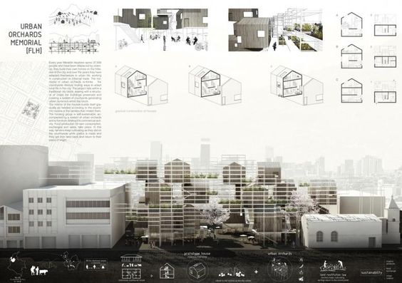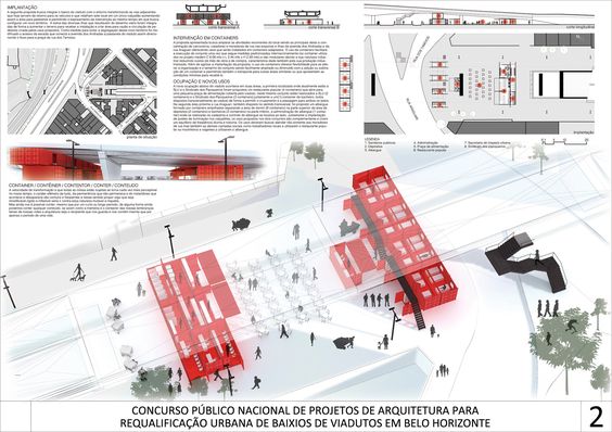 Eu resolvi dividir a prancha (A1) em três colunas,começando no topo com a imagem principal e logo abaixo o conteúdo do projeto (memorial descritivo, áreas, etc). Dos lados eu complementei com o conteúdo de suporte ao projeto (análises do entorno e perspectivas).