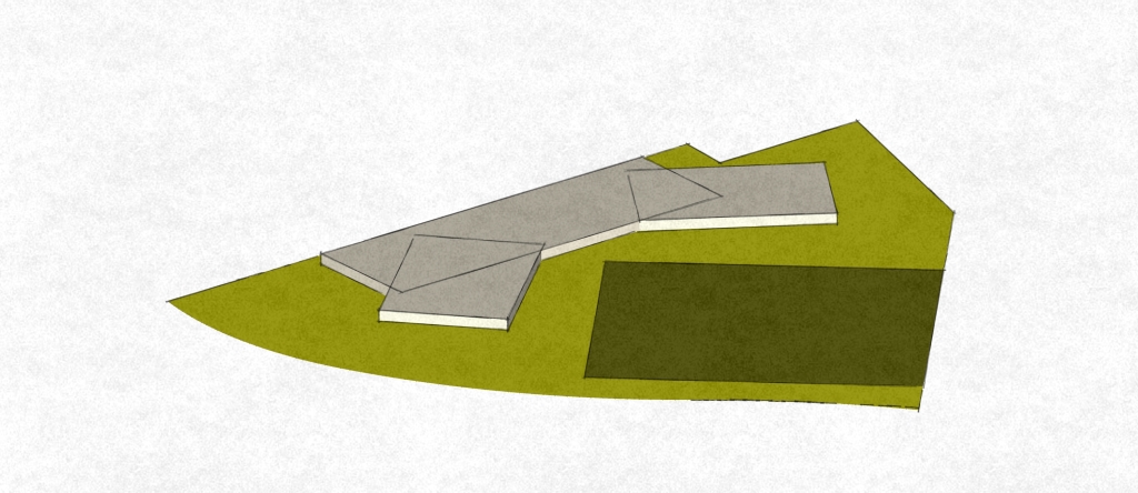 Essa foi a parte mais simples: Eu coloquei uma vista 3D no Revit e simplesmente alterei os níveis do telhado (coloquei ele a 30m de distância do 2º pav. Primeiro eu renderizei a imagem SEM o telhado (para que eu não tivesse a sombra dele em cima do projeto) e depois renderizei somente o telhado. No Photoshop eu juntei as duas imagens e diminuí a opacidade do telhado, dando um pouco de transparência nele. Também dei uma claridade nas árvores do terreno (basta duplicar a camada da imagem e diminuir a opacidade da duplicata. A camada que está por cima você vai apagando, assim vai aparecendo a de baixo que está mais clarinha, com pouca opacidade).