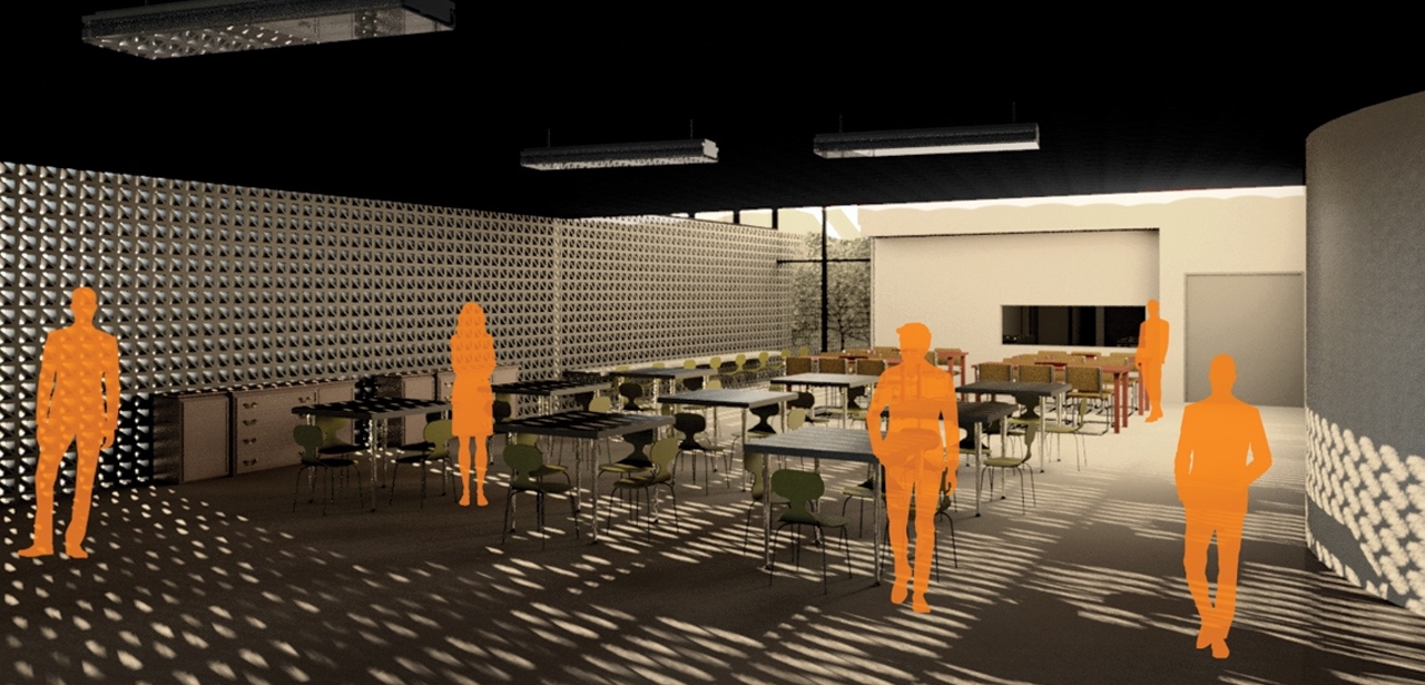 Eu queria de alguma forma mostrar o projeto como um todo, por isso resolvi colocar duas imagens do 3D do Revit em preto e branco a partir de dois ângulos, sempre mostrando o terreno. Para isso eu renderizei a vista 3D e no Photoshop eu usei a opção de desaturar a imagem (Shift + Ctrl + U) e por fim ajustei os níveis – Ctrl + L (eu sempre ajusto os níveis). Eu resolvi usar eu mesma como figura humana para ilustrar as áreas de Tiro do projeto.