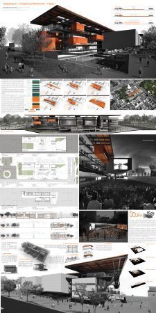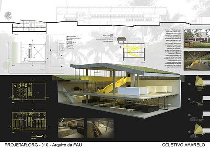 Eu tive a princípio uma certa dificuldade de lidar com a prancha na horizontal. Para eu ter uma ideia melhor do que colocar na prancha e como dispor os elementos, eu comecei salvando algumas referências de como eu imaginava a prancha. Eu queria trabalhar com cores fortes, com uma diagramação impactante e que traduzisse o partido do meu projeto, não achei muitas pranchas na horizontal com o estilo que eu queria, mas encontrei alguns com as cores que eu escolhi (preto e laranja). Estas foram as referencias que eu usei: