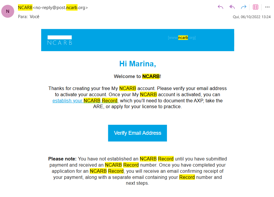 Você vai então clicar em NCARB Record para estabelecer um record. Você vai inserir todos os seus dados e ao final você irá pagar a taxa de $100 para manter o seu record ativo no site da NCARB, isso fará que você tenha acesso ao seu progresso durante 1 ano. Se em 1 ano você não terminar todo o processo, você terá que continuar renovando até terminar o processo e obter a sua licença. Você receberá um email de confirmação do seu NCARB Record.