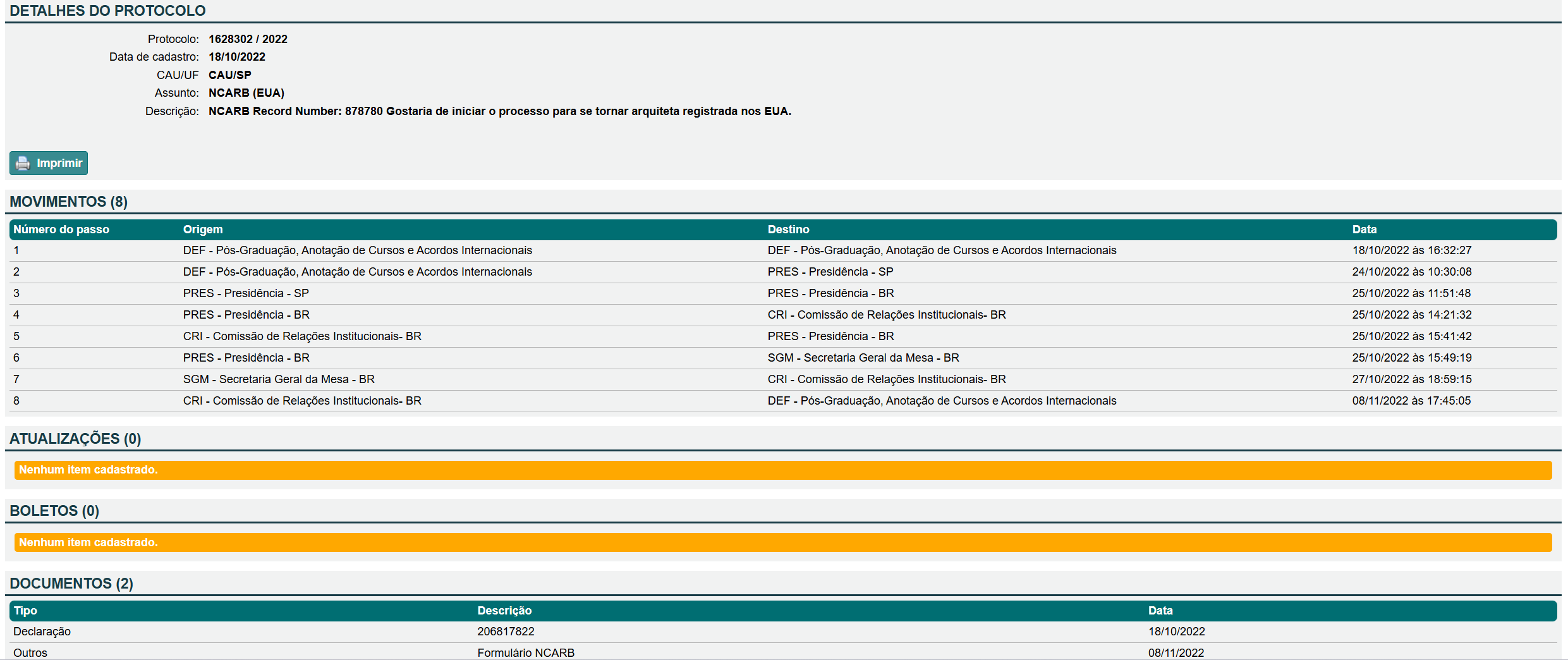 Depois vá em Protocolo -> Cadastrar Protocolo -> Assuntos Internacionais -> NCARB (EUA) e na descrição coloque o número do seu NCARB (NCARB Record Number), descrição e anexe a declaração. No meu caso eu enviei em Outubro de 2022 e foi recebido pela NCARB em Novembro de 2022. Essa parte do CAU é a parte do Credential Verification Form, o CAU é quem preenche esse form. Todas essas informações estão no site da NCARB nesse link.
