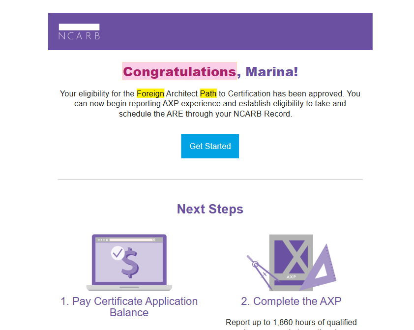 Agora que você fez essa parte do CAU, você vai ter que enviar para o NCARB o seu histórico traduzido com tradução juramentada. Eu enviei o histórico e diploma só para não ter problemas. Você não pode enviar diretamente para eles, a sua faculdade ou a empresa de tradução é quem vai poder enviar para eles. Peça para eles enviarem o documento original + a tradução para o email da NCARB: transcripts@ncarb.org (eu também enviei uma cópia para o foreignarchitect@ncarb.org) e peça para eles informarem que receberam o seu histórico e diploma em um documento SELADO (isso mesmo). Você também precisa enviar um formulário preenchido, o melhor é você mesmo preencher e pedir para a empresa de tradução ou faculdade enviarem para eles por email junto com o seu histório e diploma.