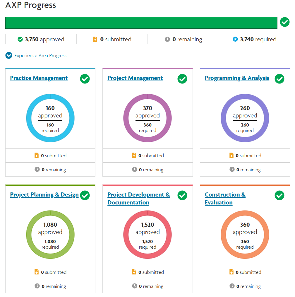 A parte difícil é quando você começa a ter várias horas em Project Planning & Design, por exemplo, e começa a ter dificuldade de conseguir horas em Construction Evaluation, por exemplo. Por isso o ideal é você conversar com o seu supervisor (arquiteto licenciado daqui que vai comprovar essas horas no sistema para você) antes de começar todo o processo de contabilização de horas.
