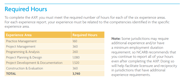 A NCARB oferece um guia para a AXP demostrando como você pode obter essas horas. Para você ter uma ideia do que cai de experiência dentro de cada área, eu recomendo você dar uma lida nas páginas 8 -13 do Guia da AXP clicando nesse link. As horas de experiência são distribuídas por área: