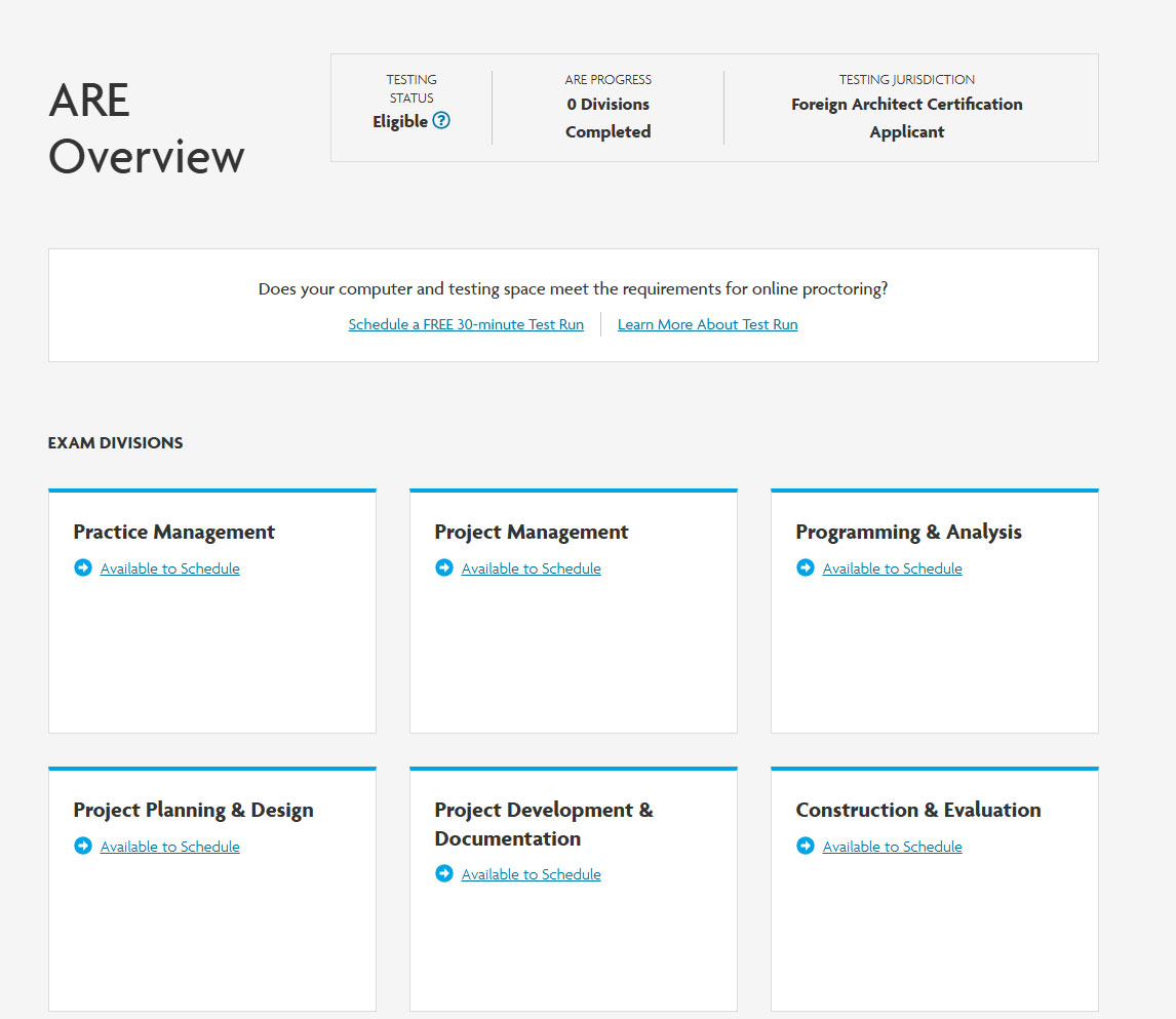 Você pode agendar as suas provas e reagendar em até 48 horas antes sem custo algum. Os custos de cada exame estão na página 15 do ARE 5 Guidelines. É normal você não passar nos testes. Caso isso aconteça, não desista, continue estudando e agende novamente a sua prova.