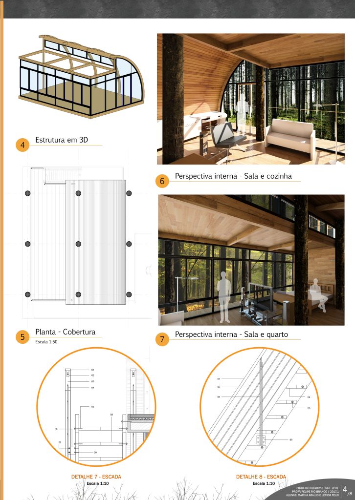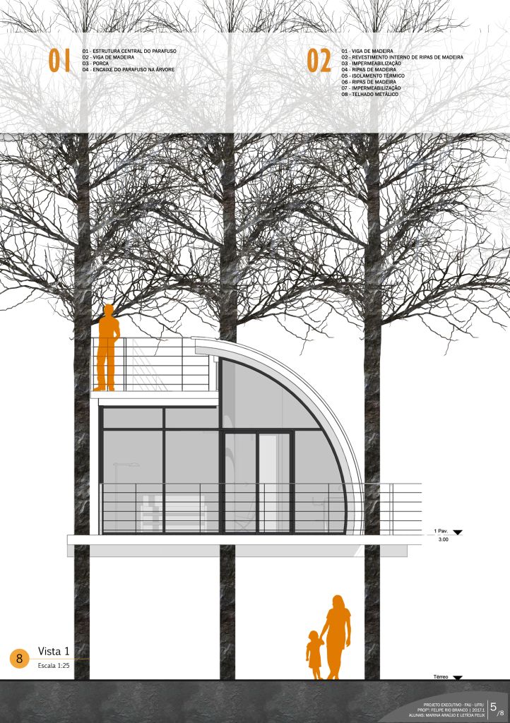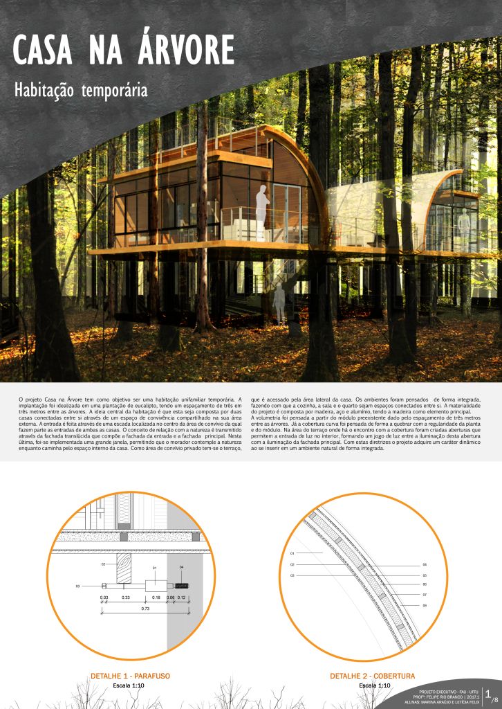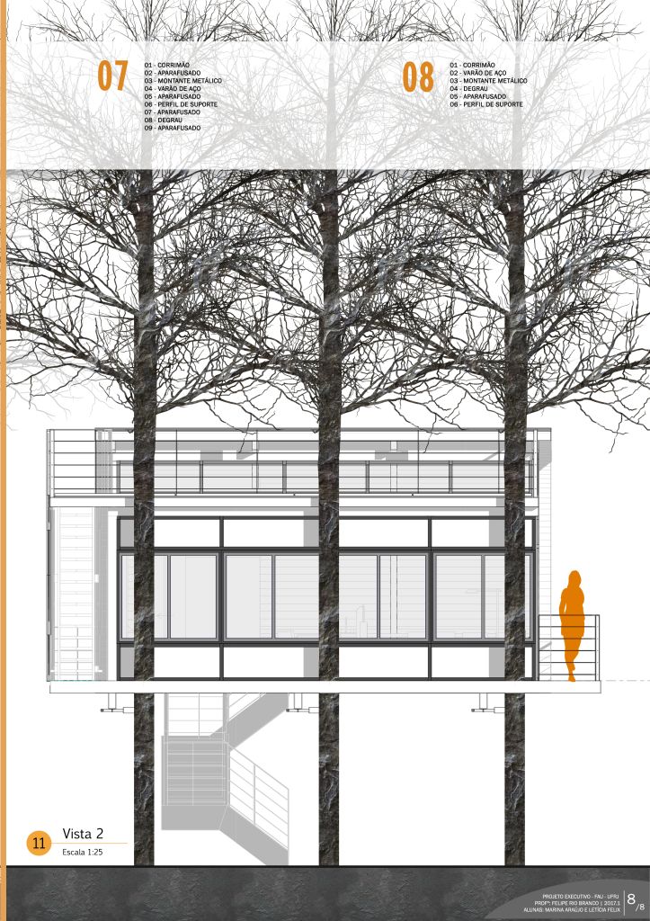 Escolhemos duas fachadas para mostrar nos desenhos. Em ambas as vistas utilizamos a sombra para dar a ideia de profundidade. Todo o projeto foi feito no Revit. A imagem em 3D da estrutura, os renders e todos os desenhos foram exportados do Revit. As vistas e as perspectivas foram trabalhadas posteriormente no Photoshop, junto com a diagramação. As legendas dos detalhes foram inseridos nas pranchas de baixo, estabelecendo uma conexão destas com as pranchas de cima. Uma faixa com transparência foi utilizada como fundo, para que se mantivesse a visão da árvores e ao mesmo tempo permitisse uma fácil leitura do texto. As cores utilizadas foram basicamente preto e cinza. Para os detalhes utilizou-se o laranja. O uso de cores variadas destacam-se mais nas perspectivas.