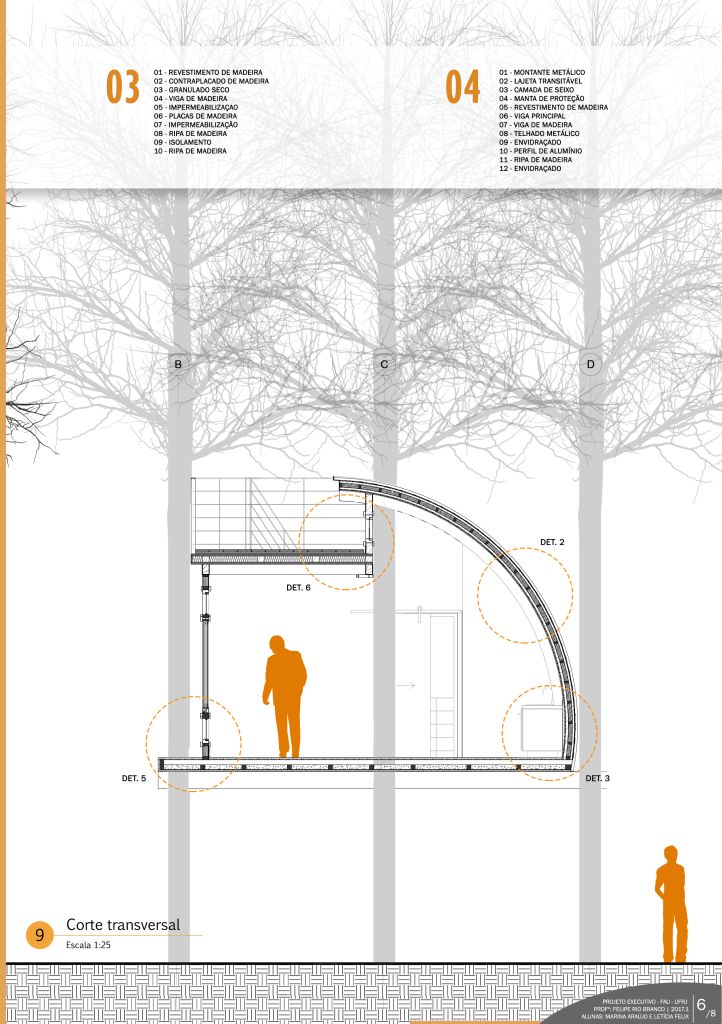 Para esse projeto, utilizamos o formato A2 para a apresentação, fora a maquete física em 1:25. Eu particularmente confesso que eu nunca demorei tanto para “conceber” uma diagramação por um pequeno problema: as imagens eram muito grandes (escala 1:25)! Levei uma tarde inteira quebrando a cabeça para descobrir qual seria a melhor forma de mostrar os desenhos e principalmente, valorizar o projeto. A forma que eu vi que melhor se adequava ao que eu precisava era trabalhando com as pranchas na vertical, contendo cada uma um desenho e dois detalhes construtivos.